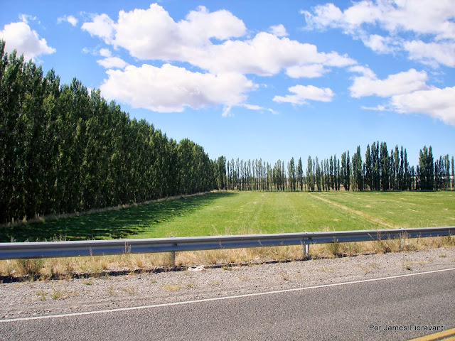 O vento estava contra e exigindo bastante. Parei para "almoçar" às 14:00. Senti que necessitava descansar um pouco e dormi encostado no portão de acesso à uma estância. Recuperadas as energias, voltei pra estrada, com a temperatura baixando bastante...